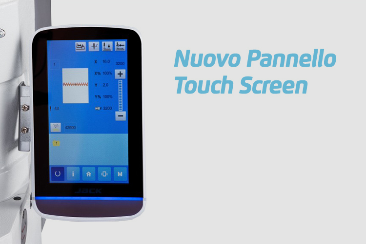 La Jack 1900GSK è fornita di serie con pannello touchscreen intuitivo che permette di programmare facilmente pattern di travettatura e di attaccatura bottoni, modificare i parametri, visualizzare i disegni e controllare errori tramite guida vocale sul display LCD.
