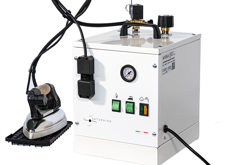Battistella Saturnino Maxi da Tavolo: generatore di vapore con caldaia inox da 5,1 L, autonomia 5–6 ore, pressione 2,8 bar e ferro EOS incluso.