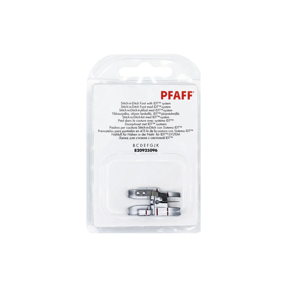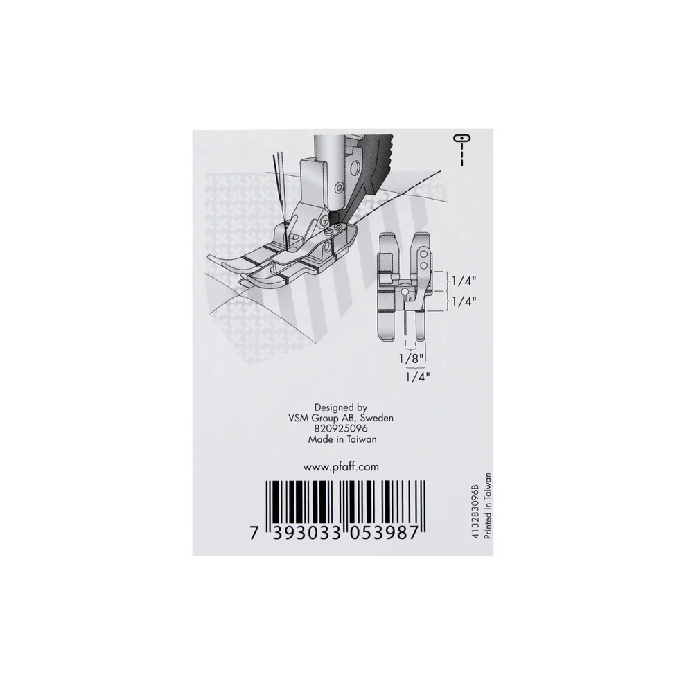 Il piedino PFAFF per cucitura Stitch-in-Ditch con sistema IDT™ è un accessorio tecnico progettato per eseguire cuciture perfettamente inserite nella cucitura esistente su macchine PFAFF famiglia dotate di trasporto integrato IDT™.