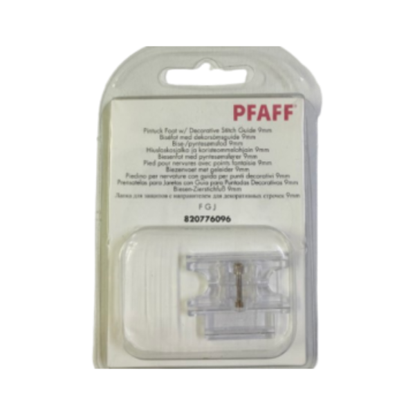 Il piedino PFAFF per nervature con guida per punti decorativi 9 mm è un accessorio progettato per realizzare nervature regolari e decorative su macchine PFAFF famiglia compatibili con punti fino a 9 mm.